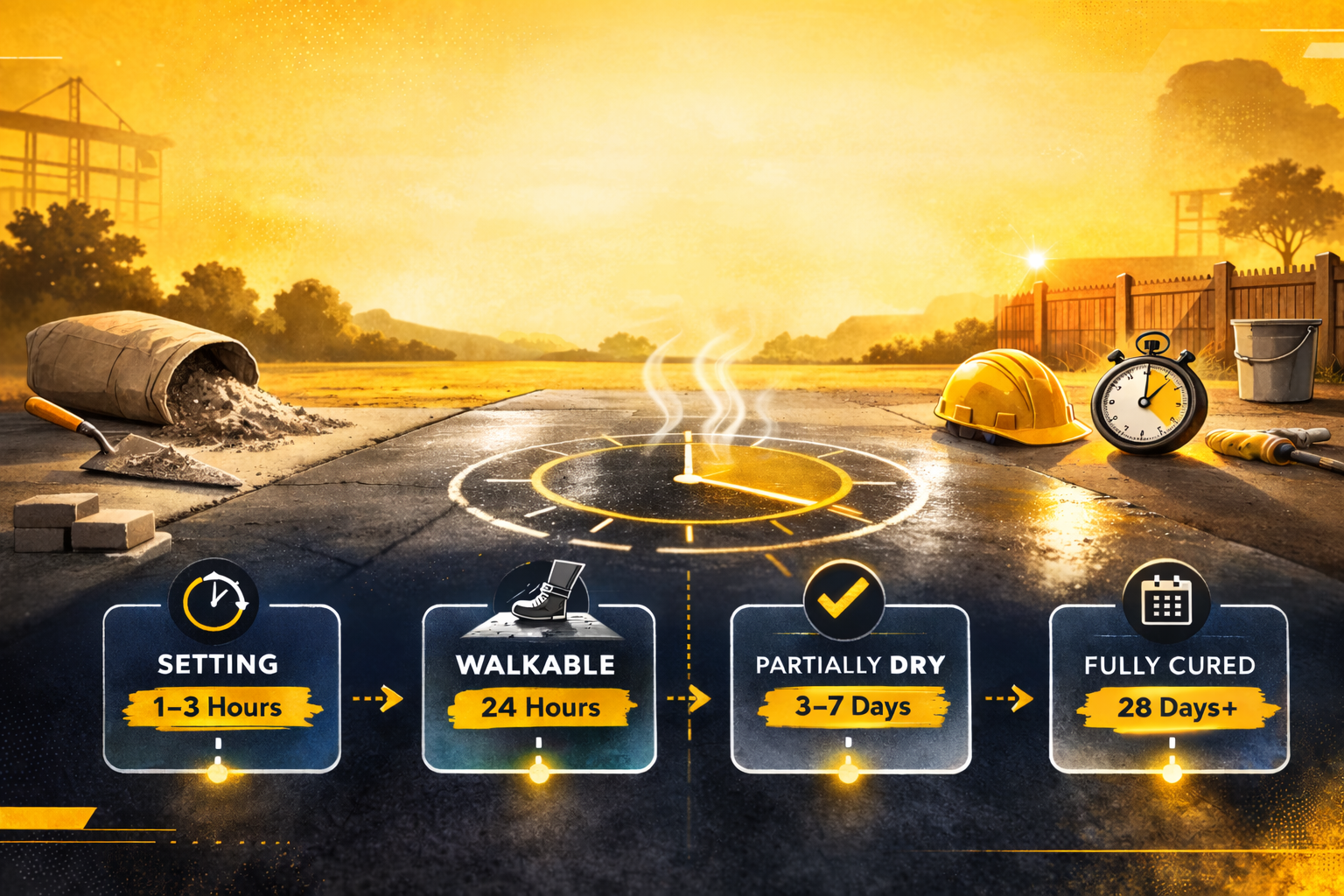 Initial Setting Time: 4-8 hours. Cement begins to harden and lose its plasticity during this phase. Avoid walking on or disturbing the surface.